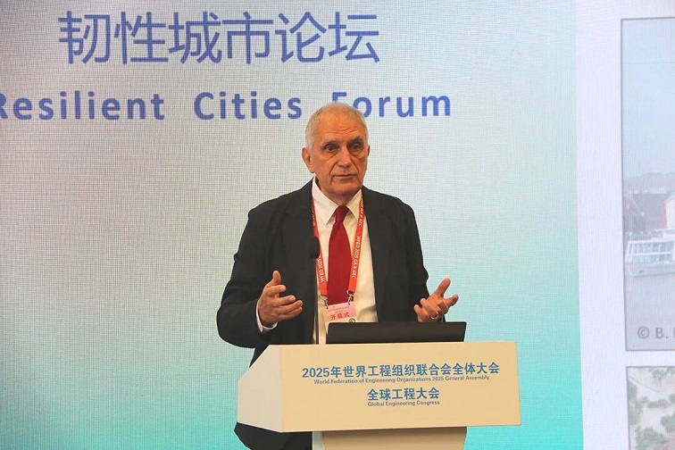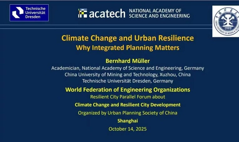 2025年10月13日,世界工程组织联合会全体大会暨全球工程大会在上海世博中心开幕。世界工程组织联合会(WFEO),是世界上最大且唯一代表全球各类工程专业和学科的非政府组织。今年大会以“工程塑造绿色未来”为主题,呼吁全球工程界承担起历史责任加速实现全球可持续发展目标。 在全球气候变化挑战日趋严峻、极端天气事件频发的时代背景下,城市作为人类经济、文化与社会的核心载体,其韧性能力建设,已成为关乎全球可持续发展的关键议题。2025年10月14日,世界工程组织联合会(WFEO)四大平行论坛之一“韧性城市论坛”,由中国城市规划学会主办,并在上海世博中心隆重举行。本次论坛旨在响应联合国可持续发展目标与新城市议程的号召,共同探索面向未来的韧性城市发展路径。来自不同国家的多位部长、司局长、院士,以及世界工程组织联合会(WFEO)前主席等国际权威专家齐聚一堂,围绕韧性城市建设展开深度对话。 中国矿业大学特聘教授、德国国家科学与工程院院士Bernhard Müller教授受邀参加本次韧性城市论坛,并作主旨报告《气候变化与城市韧性——为何综合规划至关重要?》。在报告中, Müller院士首先指出,全球正日益面临气候变化引发的“新常态”,他以中国、德国及欧洲近年遭遇的洪涝灾害为例,强调此类灾害已呈现常态化趋势,城市必须系统性提升应对气候风险的韧性能力。 Müller院士从气候数据分析入手,揭示了问题的紧迫性。通过对比1961-1990年历史数据与2071-2100年预测数据,发现不仅气温上升趋势明确,降水模式也发生显著变化:季节性降雨强度增加,导致洪涝与干旱风险同步上升。这一发现与IPCC2023年报告结论相互印证。在韧性城市建设方面,Müller院士提出了多维度的解决方案。工程层面,德累斯顿通过创新设计可移动防洪墙,既保护了曾被洪水淹没的歌剧院等重要建筑,又兼顾了城市景观完整性;生态层面,他倡导将洪泛区改造为兼具防护与休闲功能的绿色基础设施,并通过建设公园绿地和绿色建筑缓解城市热岛效应——数据显示其降温效果最高可达6.5摄氏度。尤为重要的是, Müller院士强调必须打破专业壁垒,推行跨领域整合、跨层级整合和跨主体整合。他特别指出社会心理因素的关键作用,如灾害预警的公信力建设、居民风险认知等都需要纳入规划设计考量。针对中国现状,这位长期参与中国城市建设的专家表示,虽然规划建筑行业面临调整,但恰恰因此更需要城市规划专业人才。“我们面临的挑战已经发生变化”,Müller院士强调,在气候变化背景下,综合性城市规划不仅关乎物理空间建设,更肩负着统筹政府与市场力量、构建韧性发展框架的战略使命,其重要性正达到前所未有的高度。